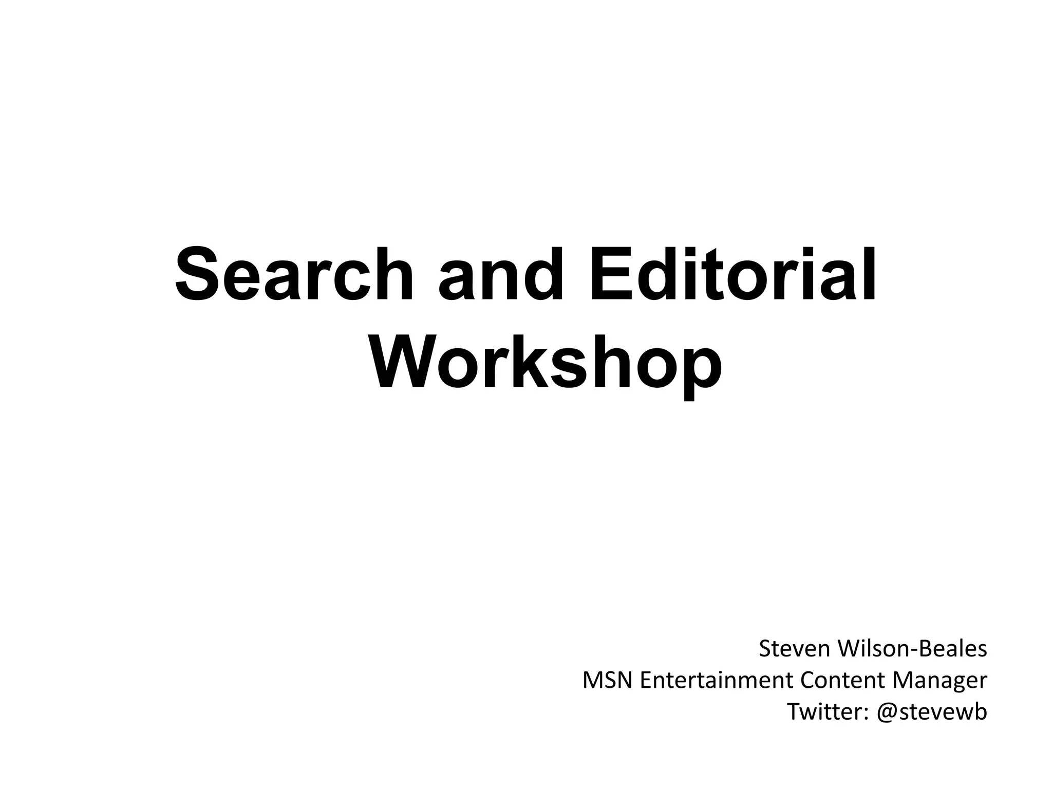 Steven Wilson-Beales will give a presentation on search and editorial at MSN. The agenda includes an introduction, discussion of how search is helping MSN with three challenges, and Steve's top ten tips for optimizing content. The tips include focusing on keywords, titles, descriptions, images, links, and ongoing training, measurement and review of content. The presentation aims to help attendees better understand how to create and curate amazing editorial experiences through search optimization.