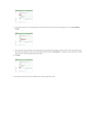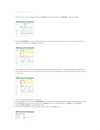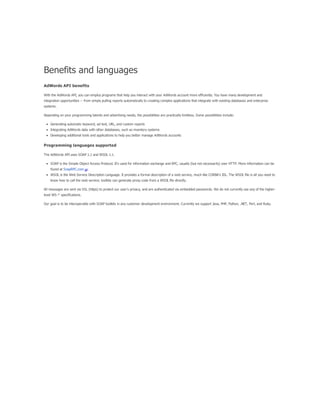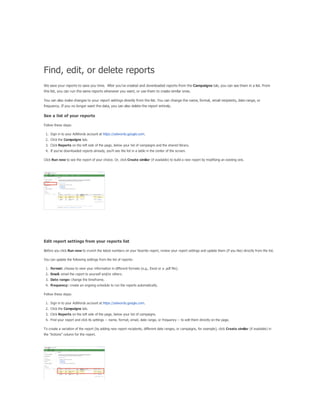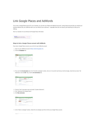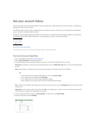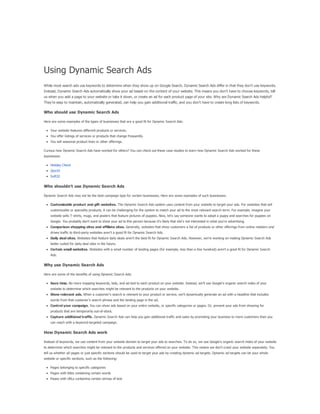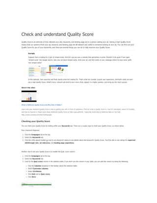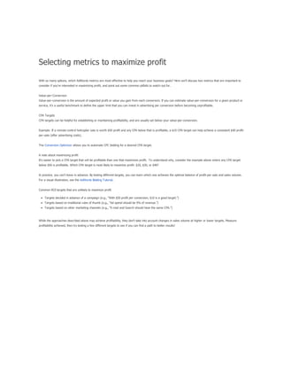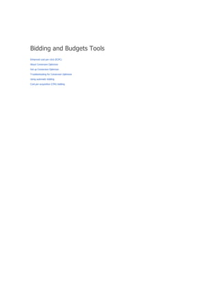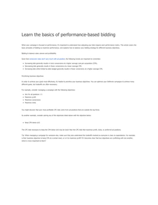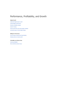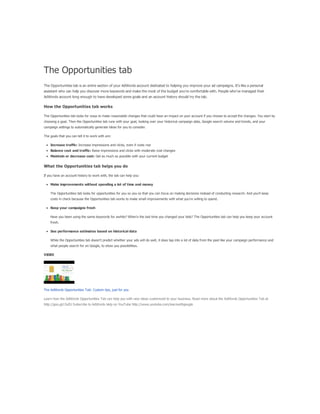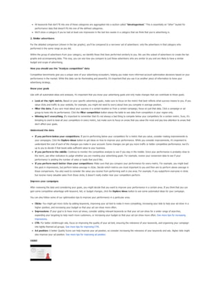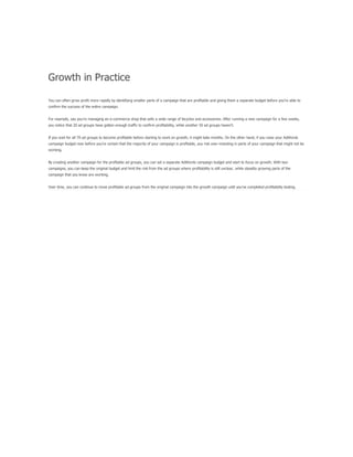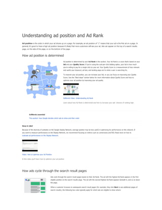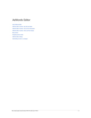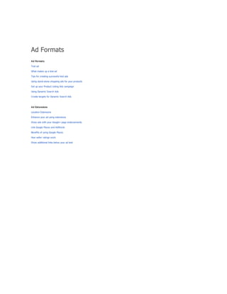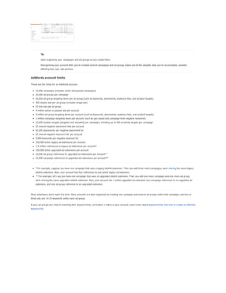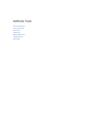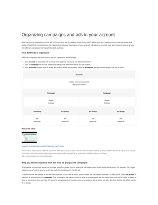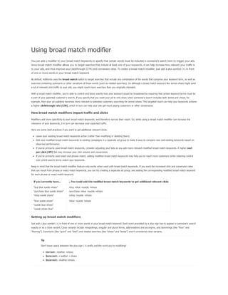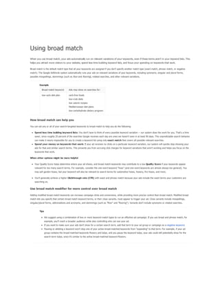 The document provides a comprehensive guide on keyword match types used in Google Ads, outlining the use of broad, phrase, exact, and negative matches to optimize ad visibility and effectiveness. It emphasizes a 'broad-to-narrow' strategy, recommending starting with broad matches and refining based on performance data to filter out irrelevant traffic. Additionally, the document discusses the structure of an AdWords account, including campaigns and ad groups, and highlights the components and requirements for creating effective text ads.