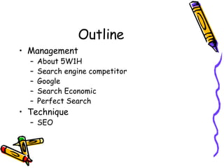 Search Economic(1/3) Google給了什麼,就拿走什麼 Google dance Sale : 2bigfeet.com SEO : Webmaster world Black hat hacker White hat hacker Sandbox: 不能有效的識別哪些是作弊或者不作弊頁面,但是可以通過這種行為有效的打壓 SEO 市場