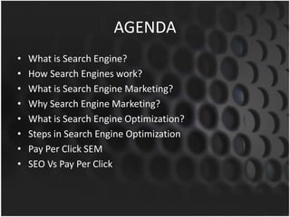 This document discusses search engine marketing and optimization. It begins with defining search engines and how they work by indexing web pages and returning relevant results based on algorithms. It then defines search engine marketing as a form of internet marketing aimed at increasing website visibility in search results. Key tactics discussed include search engine optimization through on-page optimization and link building, as well as pay-per-click advertising. The document provides tips for implementing both SEO and pay-per-click campaigns and compares their advantages.