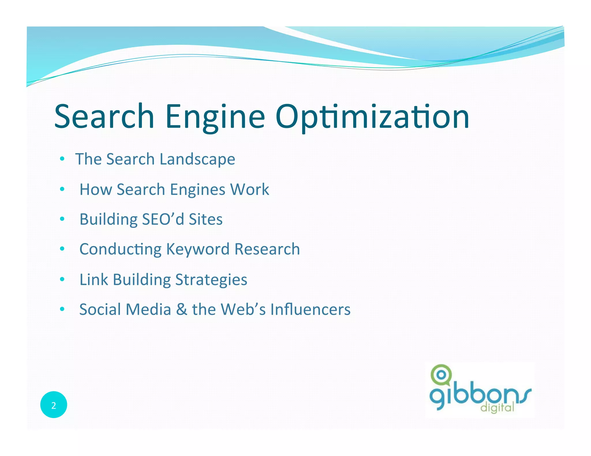 The document provides an overview of search engine optimization (SEO) strategies and tactics. It discusses the search landscape and how search engines work. Key sections include building SEO-optimized websites, conducting keyword research, link building strategies, and using social media to boost SEO. Specific tips covered are optimizing page titles, meta descriptions, images, URLs and using tools like Google Analytics to measure SEO performance.