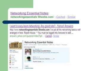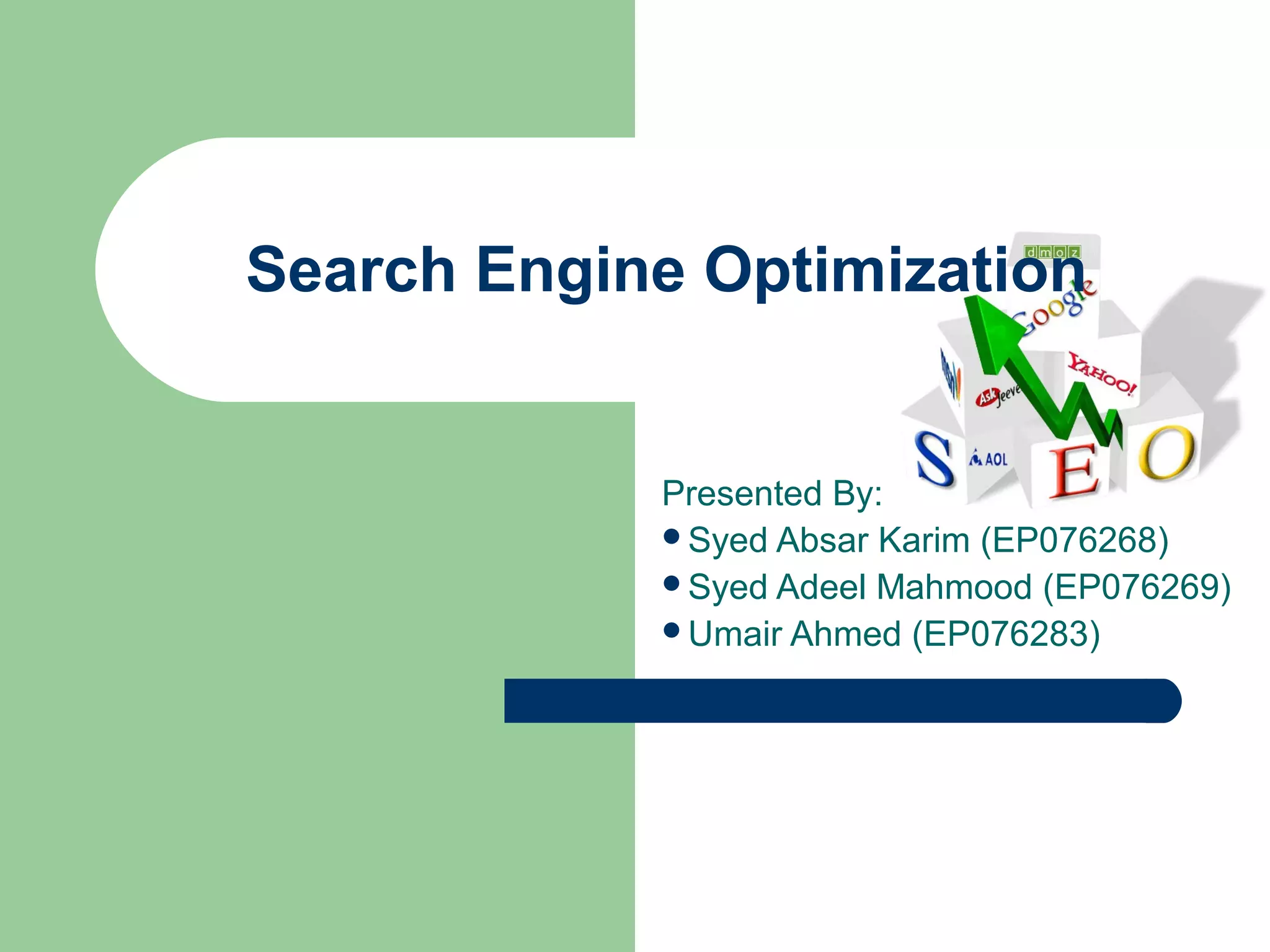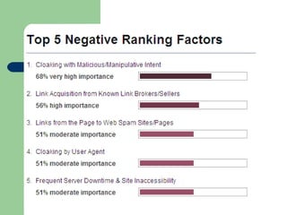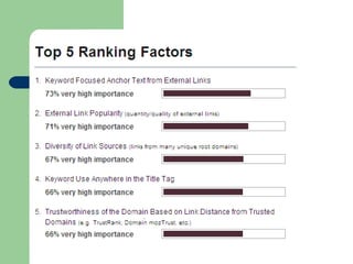 This document provides an overview of search engine optimization (SEO). It discusses what SEO is, why search engines are important, and how search engines work by employing crawler programs to index websites. It also outlines the on-page and off-page SEO processes, including technical elements like titles, meta tags, URLs and linking, as well as white hat versus black hat techniques. Practical tips are provided for online success, including identifying audiences, competitors and keywords, building content and links, and monitoring results. Google tools like Webmaster Tools and Analytics are also mentioned.