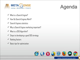 This document provides an overview of search engine optimization (SEO) services. It defines what a search engine is and how they work by crawling websites, indexing content, and ranking pages in their databases using algorithms. The document outlines why SEO is important for driving traffic, tips for optimization like targeting keywords and links, and the main factors search engines consider like titles, links and content. It promotes SEO services from MetaSense and includes their contact information.