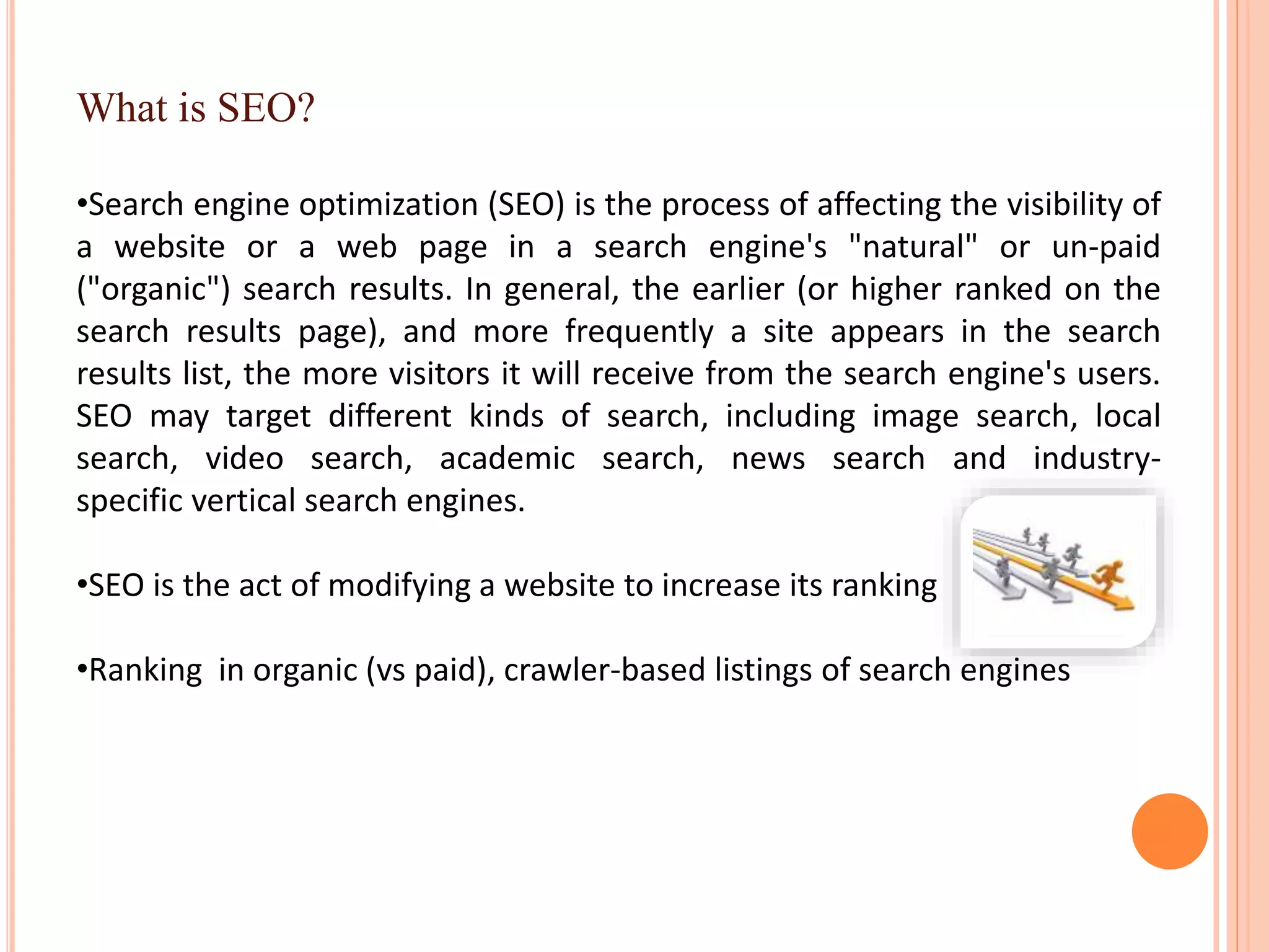 SEO (search engine optimization) is the process of affecting the visibility of a website in organic search results. The goal is to have a site rank higher and appear more frequently in search results. SEO targets different kinds of search and involves modifying sites to increase their ranking through factors like keyword research, content optimization, social sharing and backlinks. Some advantages are lower costs than paid ads, increased traffic, brand credibility from ranking on Google, and permanent results. Measuring SEO success includes tracking keyword rankings, website traffic, and revenue metrics.