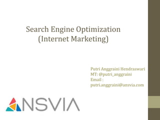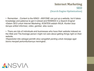 Dokumen ini menjelaskan pentingnya optimisasi mesin pencari (SEO) dalam pemasaran internet, menekankan bahwa konten berkualitas adalah kunci untuk meningkatkan peringkat dan kunjungan situs. Terdapat dua jenis SEO yang dijelaskan, yaitu on-page dan off-page, yang semuanya berkontribusi terhadap strategi pemasaran yang lebih besar. Penulis mendorong pembaca untuk memulai praktik SEO mereka untuk mencapai tujuan bisnis.