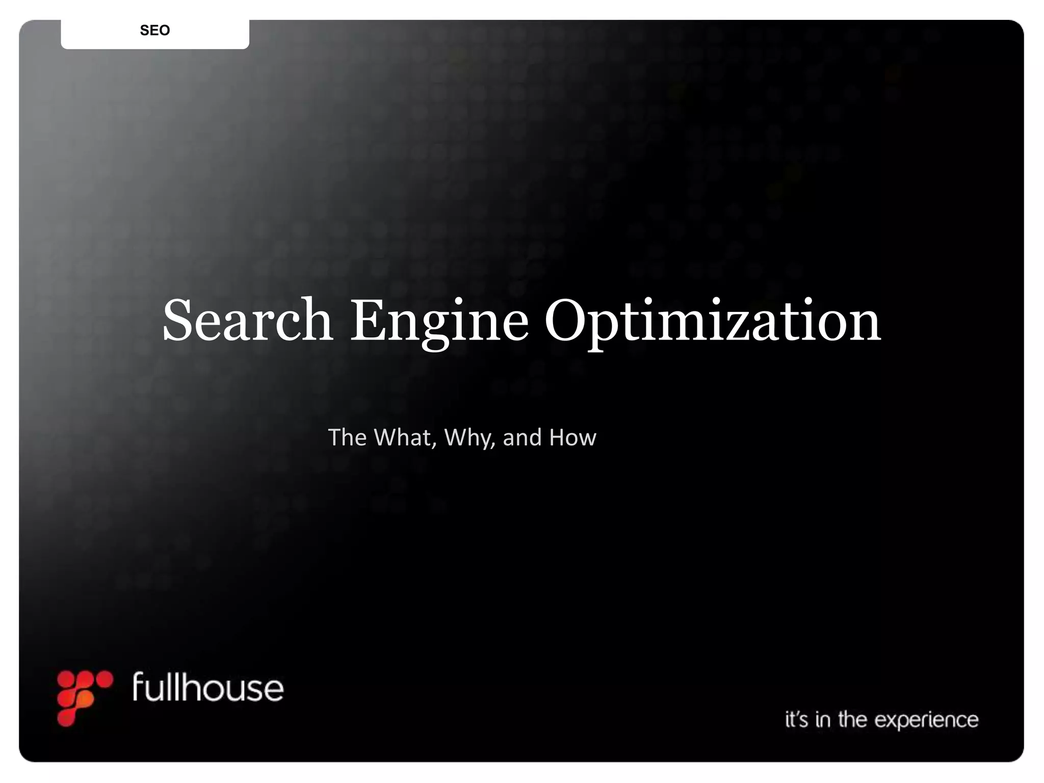Search engine optimization (SEO) involves optimizing web pages to increase traffic from search engines. SEO is important because search engines are the second most popular internet activity and people trust search results. Search engines use spiders that crawl and index web pages, storing content in an index used to return relevant results. Key aspects of SEO include optimizing content, site architecture like URLs and navigation, and building internal and external links. Effective SEO involves an initial audit, keyword research, optimizing pages, implementation, link building, and analyzing metrics like traffic, bounce rate, and conversions over time.