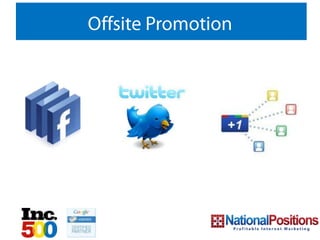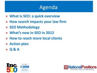 This document provides an overview of search engine optimization (SEO) strategies for lawyers. It discusses how SEO impacts law firms by driving organic traffic from search engines. The SEO methodology involves analyzing a website and goals, researching keywords, developing content, optimizing the website code, and promoting the site offline. Recent changes to Google's algorithm prioritize quality content and social signals. The presentation provides tips for lawyers to attract more local clients through local SEO, citations, and reputation management online. An action plan is suggested to measure SEO performance over five key areas.
