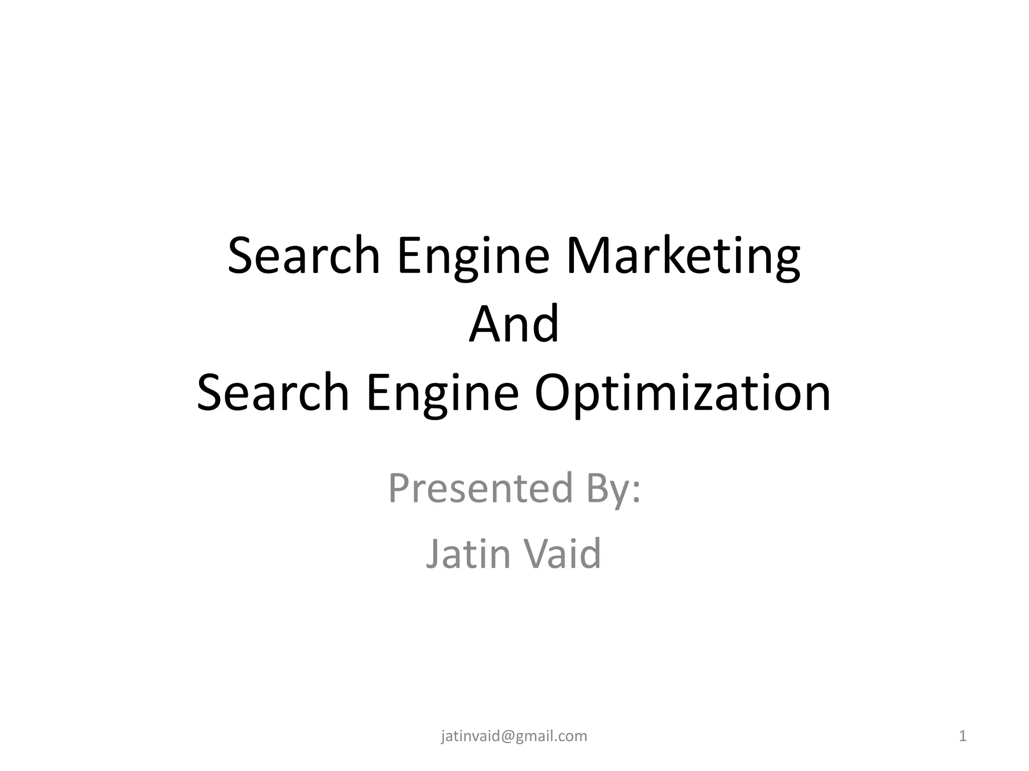 This document discusses search engine marketing and search engine optimization. It defines search engines and how they present search results. Search engine marketing is described as using promotion techniques to increase website visibility in search results. The two main components are search engine optimization (SEO), which involves organic optimization practices, and search advertising, which are paid placement options. The document outlines best practices for SEO, including on-page elements like keywords and off-page elements like links. It also discusses setting goals and analyzing results.
