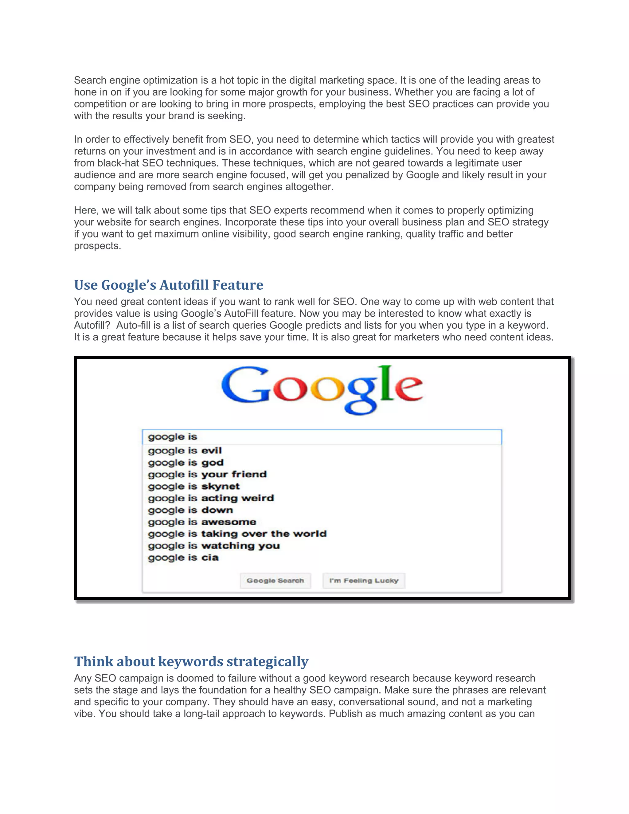 This document provides tips for effective search engine optimization. It recommends determining tactics that provide the greatest returns within search engine guidelines, and avoiding black-hat techniques that could result in penalties. Some tips include using Google's autofill feature for content ideas, taking a strategic approach to keyword research, responding to algorithm changes, optimizing page speed and formatting for usability, earning natural links rather than buying them, checking for and fixing broken links, focusing on fresh engaging content, and incorporating social media into marketing strategies. The overall message is that following best practices can enhance rankings and provide a better user experience.