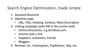 Search engine optimization can be made simple by following four key steps: conducting keyword research, optimizing web pages by updating URLs, titles, headings, content and meta descriptions, running a linking campaign with keywords in anchor text through online directories and articles, and getting reviews on sites like Google+, Yelp and TripAdvisor. To audit a website, use tools like PRChecker, SimilarWeb, Marketing Grader and Moz to collect information on the home page and compare to competitors.