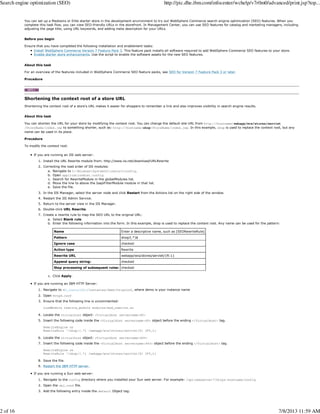This document provides information about search engine optimization (SEO) functionality in WebSphere Commerce. It describes how to set up SEO on a starter store, including shortening the store URL context root, testing SEO-friendly URLs, and using pattern files to construct SEO-friendly URLs. It also covers optimizing page metadata, URL redirects, generating sitemaps, and customizing the SEO component configuration.