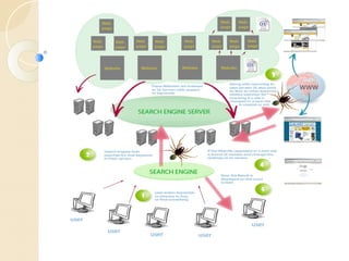 This document outlines the fundamentals of search engines, SEO processes, and optimization techniques. It details the five-step SEO process, emphasizing pre-site, on-site, and off-site activities to enhance website performance in search engines. Additionally, it discusses the importance of link building, differentiates between white hat and black hat SEO practices, and lists tools for effective SEO management.