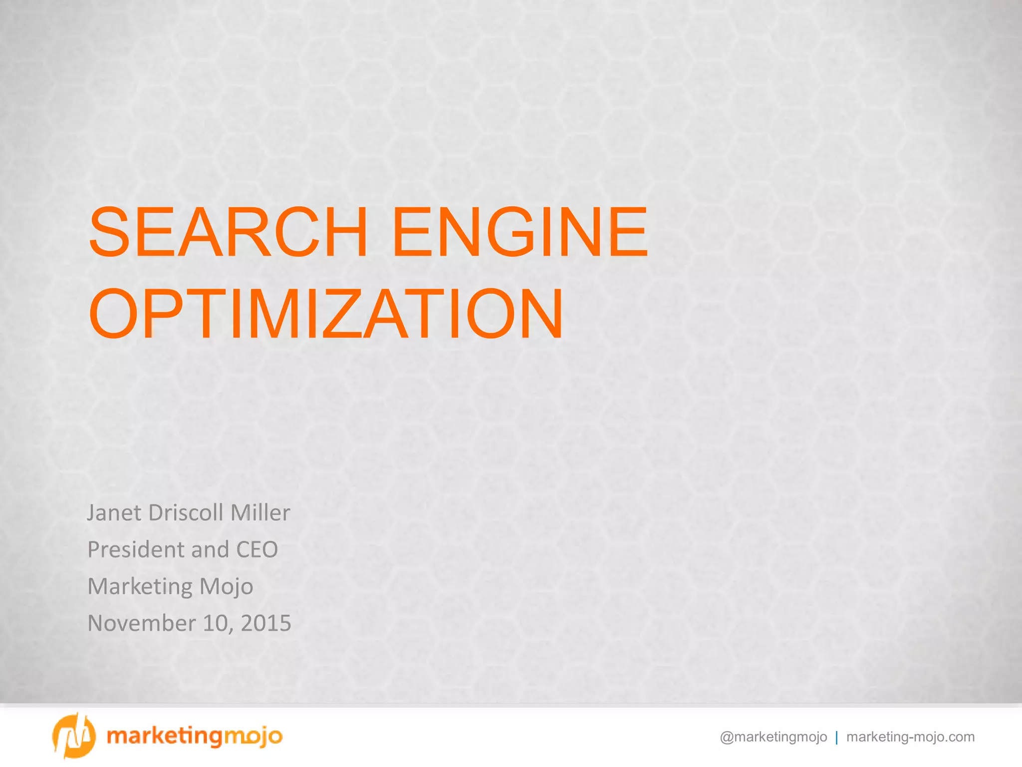 Marketing Mojo is a search engine optimization (SEO) and digital marketing firm. The presentation discusses SEO fundamentals including keyword research, content optimization, link building, and social media marketing. It also covers SEO ranking factors and how search engines work. The presentation emphasizes the importance of mobile optimization and retargeting for digital marketing success.