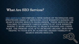 SEO services involve a variety of strategies designed to enhance website ranking on search engine results pages, ultimately increasing organic traffic. Key components include keyword research, on-page and off-page optimization, technical SEO, content creation, local SEO, link building, and performance analytics. The goal is to improve visibility and user experience, driving targeted traffic to the site.
