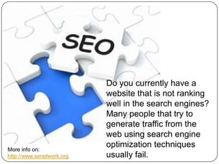The document provides SEO tips to improve website rankings in search engines, emphasizing the importance of using primary keywords in title tags and throughout content. It advises maintaining a word count of 1000 to 2000 on main pages and acquiring both high and low PR backlinks for better visibility. Additionally, it highlights the role of internal links connecting main pages to secondary content to enhance search rankings.