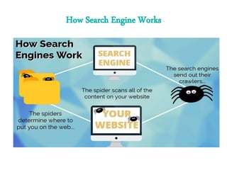 The document outlines the operations of search engines, detailing three main stages: crawling, indexing, and retrieval. It explains how web crawlers collect and update data, create an index of web pages, and leverage algorithms to provide relevant search results, while also highlighting the evolution of Google's algorithms through various updates over the years, aimed at improving search quality and penalizing low-quality content. Key updates included shifts towards better understanding user intent, the importance of mobile-friendliness, and the integration of algorithms that prioritize high-quality content.