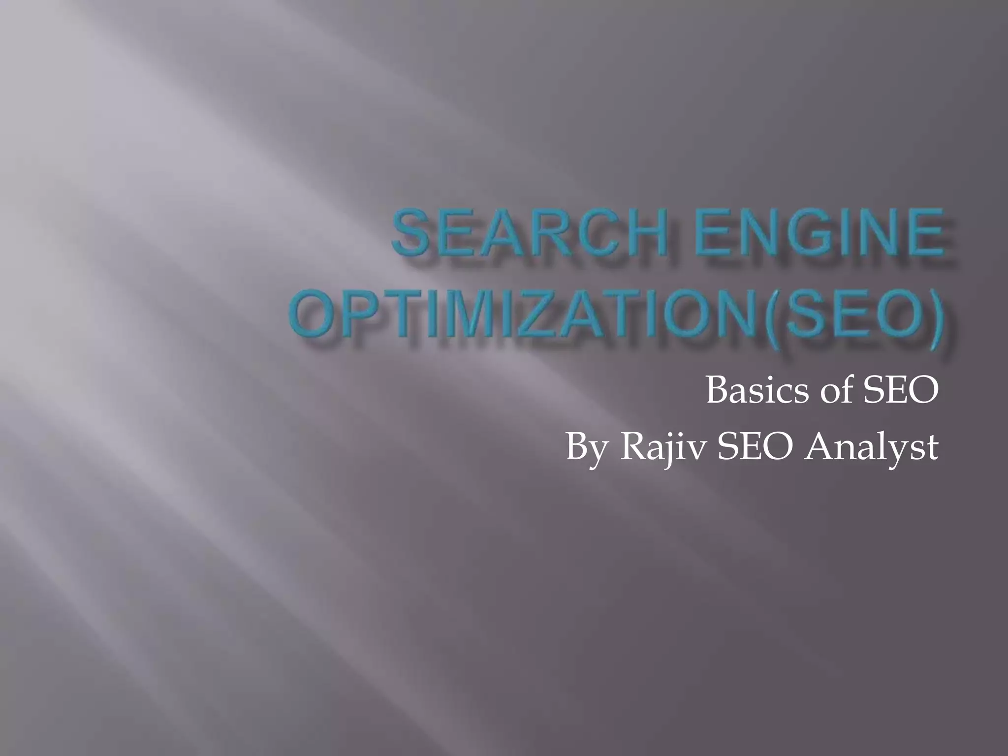 The document outlines the basics of search engine optimization (SEO), emphasizing its importance in driving traffic and improving website rankings through on-page and off-page techniques. It describes key elements such as keyword research, title and meta tags, as well as backlink strategies to enhance visibility in search results. It also highlights the gradual timeline for achieving noticeable results in SEO efforts.