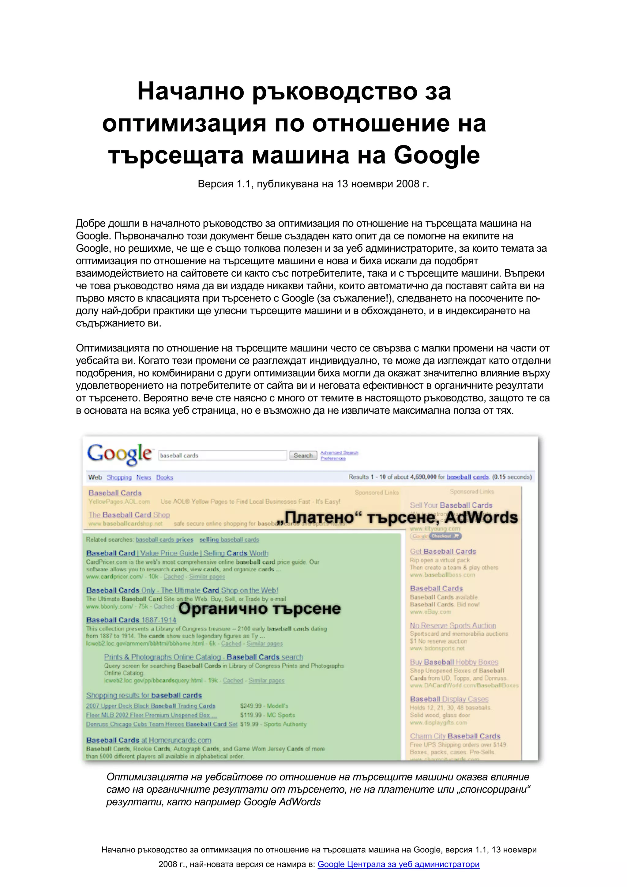 Начално ръководство за оптимизация по отношение на търсещата машина на Google, версия 1.1, 13 ноември