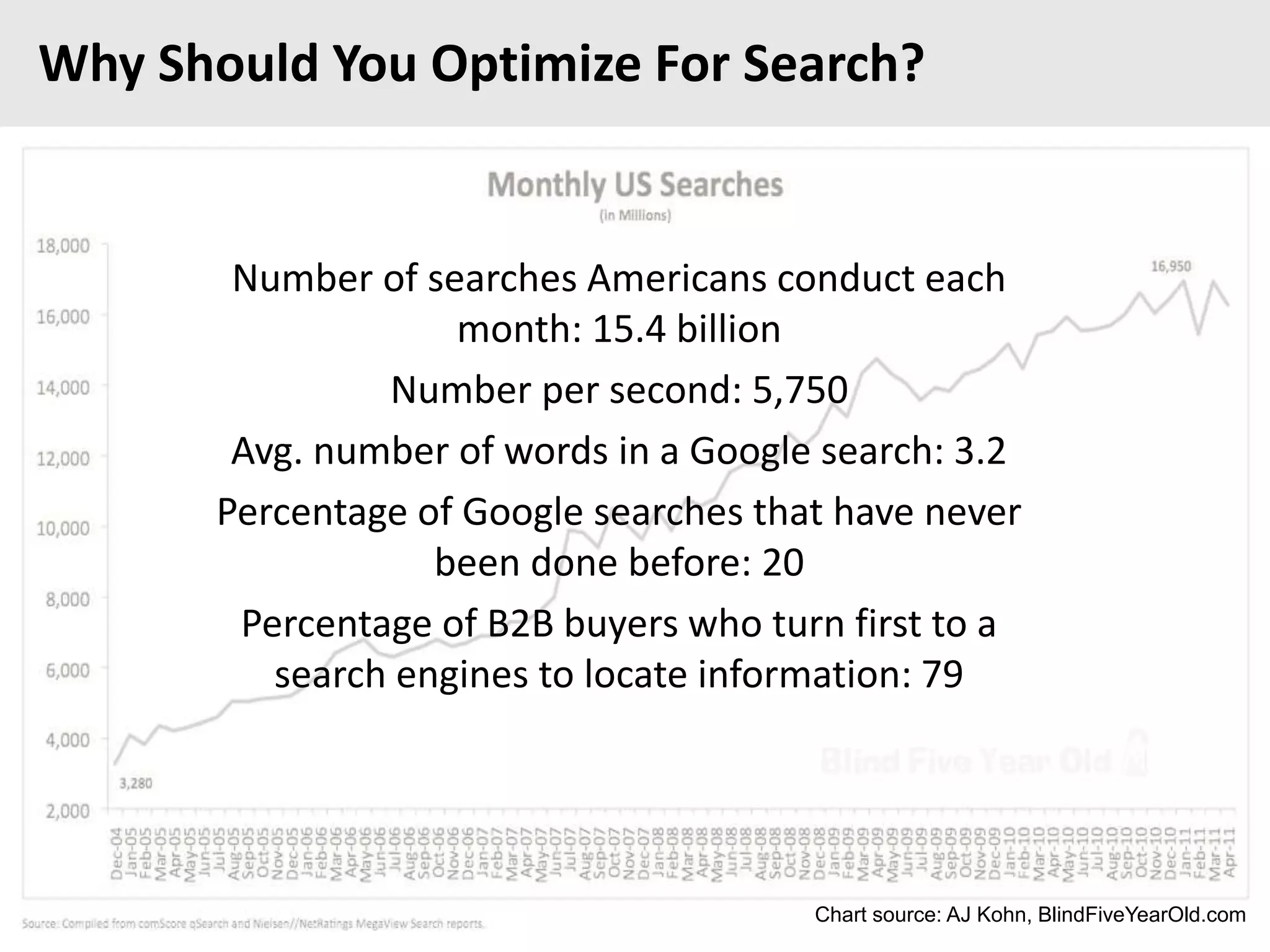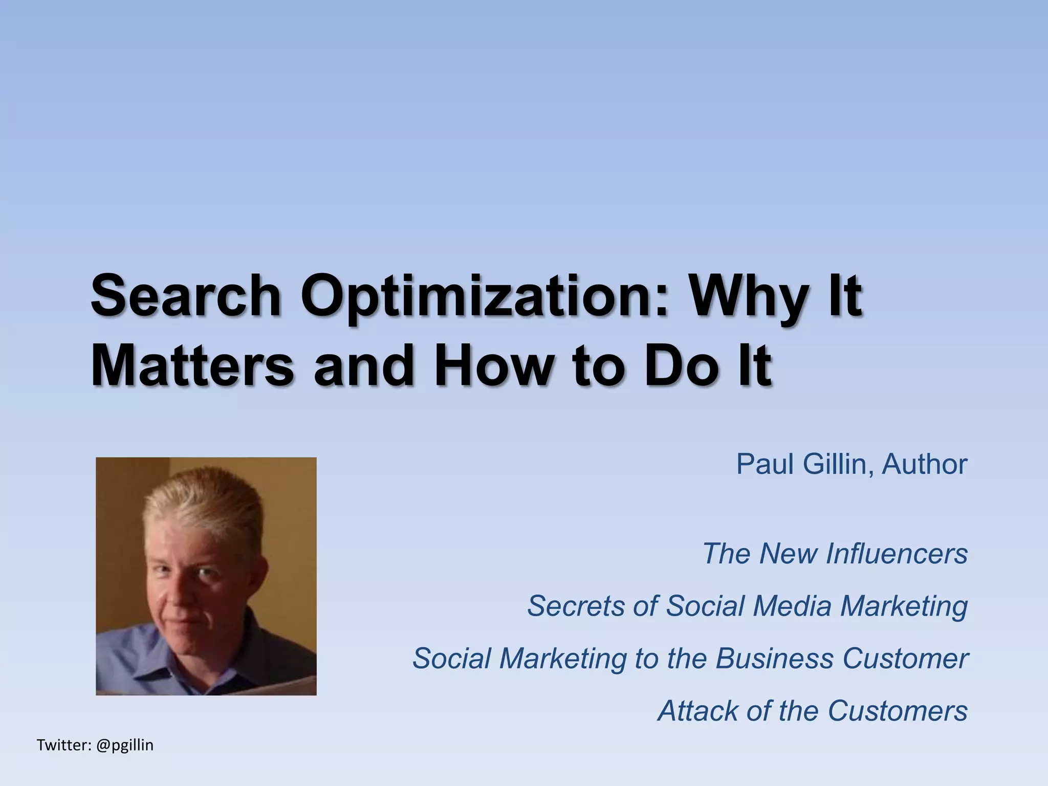 The document discusses the importance of search optimization, detailing key statistics about search behaviors and outlining effective techniques for selecting keywords and improving website visibility. It emphasizes the significance of quality content, proper URL construction, and the value of inbound links in enhancing search rankings. Additionally, it highlights recent changes in search algorithms and the evolving nature of search criteria and strategies.