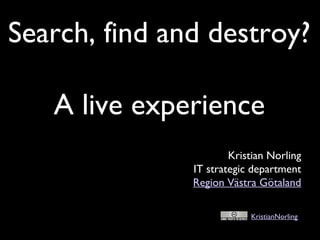 The document is a presentation by Kristian Norling regarding IT strategies in Västra Götaland. It discusses several design principles aimed at enhancing search and discovery processes in digital environments. The presentation concludes with an invitation for questions and provides contact information for further engagement.