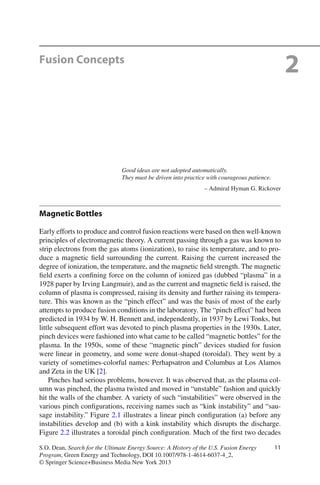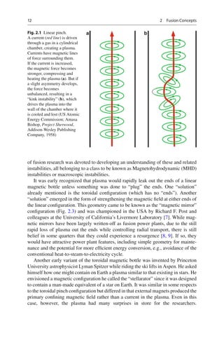 Early fusion experiments in the 1950s used "magnetic bottles" to confine hot plasma using electromagnetic fields. Two main approaches were the linear "pinch" configuration and toroidal designs. However, plasmas in these devices were unstable and short-lived due to kink, sausage, and other instabilities. In the 1950s, the toroidal "stellarator" was developed to provide stable confinement without instabilities driven by plasma currents. The Soviet "tokamak" design added magnetic fields from external coils to the toroidal pinch and showed greatly improved stability and confinement in the late 1960s. Inertial confinement using high-power lasers was also proposed in the 1960s as an alternative approach to initiating fusion reactions.