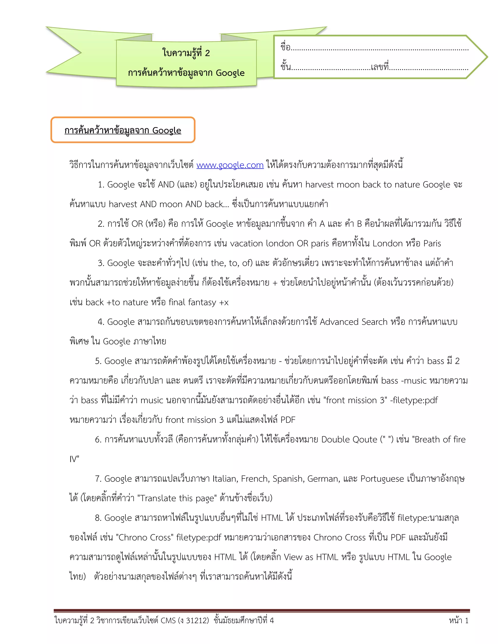 ของไฟล์ เช่น "Chrono Cross" filetype:pdf หมายความว่าเอกสารของ Chrono Cross ที่เป็น PDF และมันยังมี