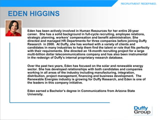 Eden Higgins has over 20 years of experience in human resources, including recruiting, employee relations, and benefits administration. She has managed HR departments for three companies. At Duffy Research, she has helped clients in many industries find talent. Recently, she has focused on the solar and renewable energy sector. Eden earned a Bachelor's degree in Communications from Arizona State University.