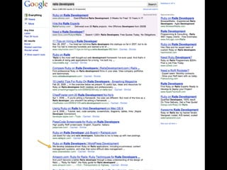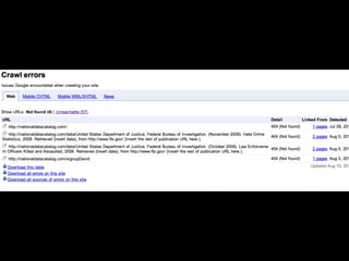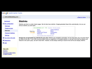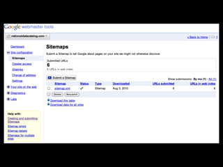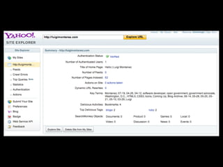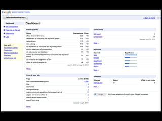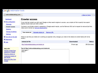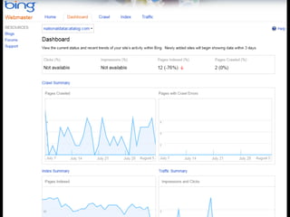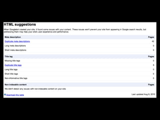 This document discusses search engine optimization (SEO) and provides tips for improving a site's ranking in search engines. It recommends focusing on user experience over manipulation, following best practices like using semantic HTML and readable URLs, and using tools from Google, Bing and Yahoo to monitor how search engines interact with your site. The key takeaways are to think like a searcher, optimize page titles, use Google Webmaster Tools, and read the Google Webmaster Blog.