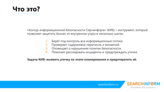 Документ описывает систему 'контур информационной безопасности серчинформ', предназначенную для защиты бизнеса от внутренних угроз через контроль информационных потоков и предотвращение утечек. Система включает множество модулей, отслеживающих различные каналы связи и действия сотрудников, а также предоставляет инструменты для расследования инцидентов и формирования отчетов. Предусмотрена возможность гибкого лицензирования и получения бесплатной пробной версии продукта.