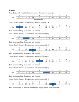 The document discusses two searching algorithms - linear search and binary search. Linear search sequentially compares the target element to each element in the array, while binary search uses a divide and conquer approach to quickly hone in on the target element in a sorted array. Both algorithms are demonstrated with pseudocode and examples.