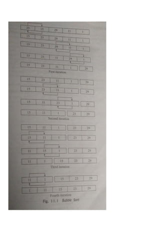The document explains searching methods in arrays, primarily focusing on linear and binary search algorithms. Linear search is a simple technique that checks each element sequentially and has a time complexity of O(n), while binary search works efficiently with sorted arrays, using a divide-and-conquer approach with a time complexity of O(log n). It also briefly covers sorting methods, including bubble sort, insertion sort, and selection sort, along with their complexity and operational details.