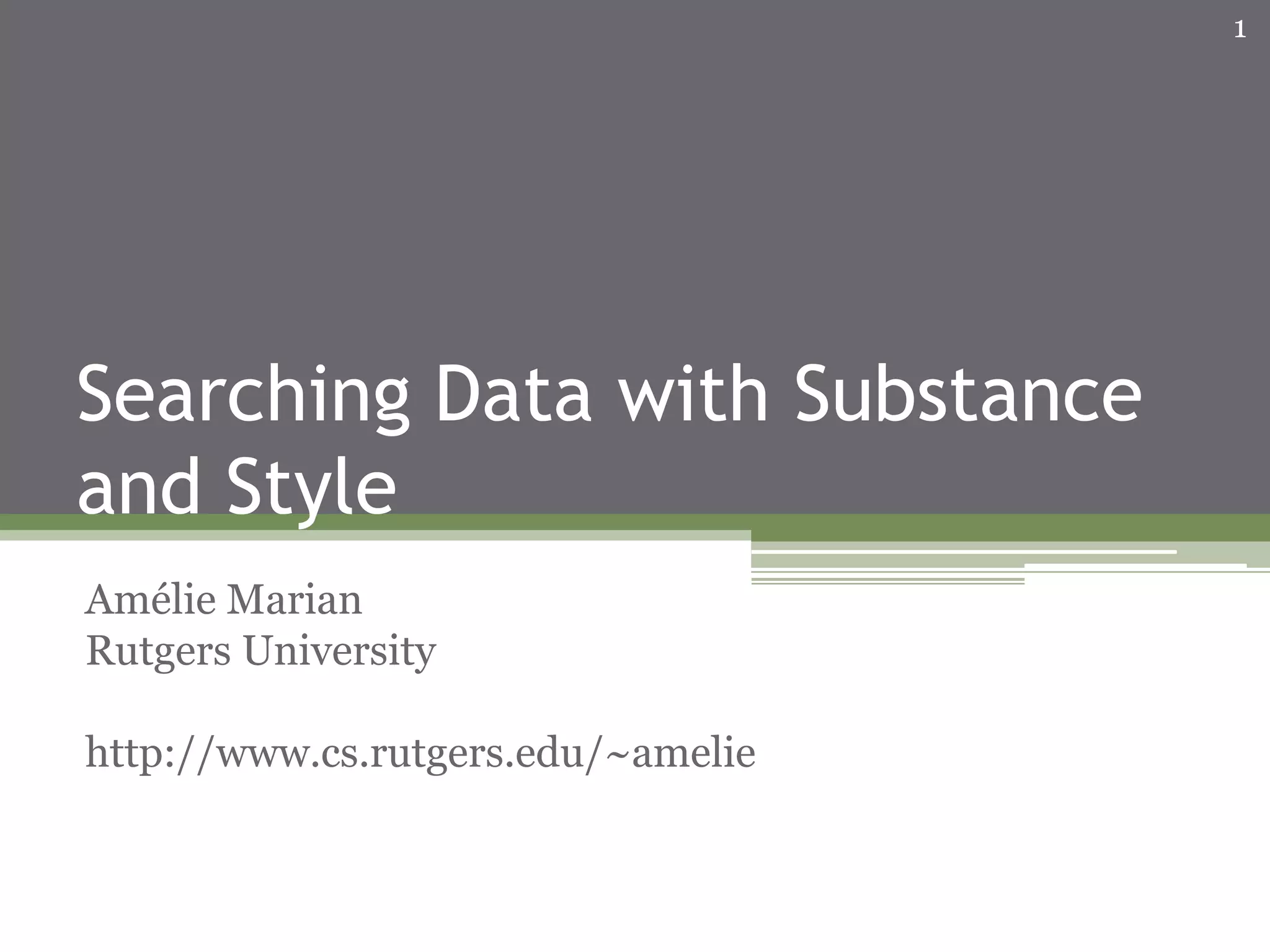 The document discusses semi-structured data processing and personal information search. It describes research at Rutgers University on developing tools for searching semi-structured data that unifies content and structure. The research aims to allow queries to contain both structural and content components and return results even if queries are incomplete. It proposes approaches like defining a unified data model, query relaxations to approximate queries, and scoring frameworks to rank unified search results.