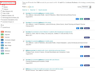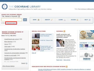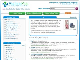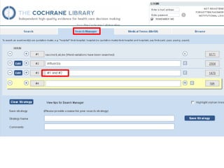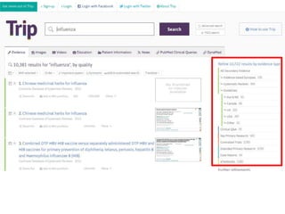 This document provides information on searching for health-related information online. It recommends using specialized search engines that filter results to high-quality sources. It describes several tools for searching medical literature databases, including Medline Plus, Evidence Search, TRIP, PubMed, Web of Science, and Scopus. It also discusses strategies for broadening and narrowing searches, such as using Boolean operators, phrase searching, and subject headings. The goal is to help users efficiently find trustworthy information from curated sources.
