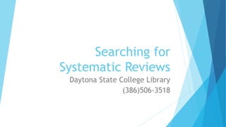This document provides instructions for searching CINAHL, Medline, and Ovid Nursing databases to find systematic reviews. It recommends using the publication type dropdown menu in CINAHL and Medline to select systematic review, and typing the search term followed by "systematic review" in Ovid Nursing. It also advises limiting results to those published within the last 5 years and checking the peer reviewed box in CINAHL and Medline.