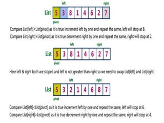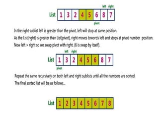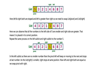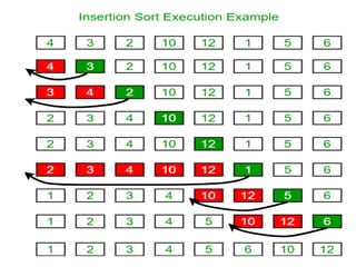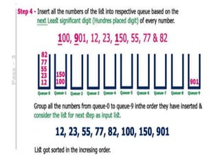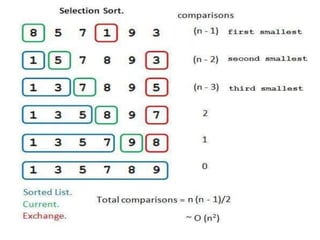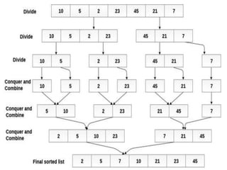 This document discusses various sorting and searching algorithms. It begins by listing sorting algorithms like selection sort, insertion sort, bubble sort, merge sort, and radix sort. It then discusses searching algorithms like linear/sequential search and binary search. It provides details on the implementation and time complexity of linear search, binary search, bubble sort, insertion sort, selection sort, and merge sort. Key points covered include the divide and conquer approach of merge sort and how binary search recursively halves the search space.