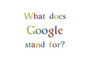 This document provides a summary of various Google tools and features for improving searches, including Google Squared for creating lists on topics, Google News Timeline for creating timelines of news concepts, Google Wonder Wheel for narrowing search topics visually, Google Book Search for searching books, and Google Scholar for finding scholarly literature. It also lists tips for improving searches using operators like quotes, tildes, and defines and provides examples of using Google as a basic calculator or for converting units of measure. Finally, it suggests creating a classroom Google account.