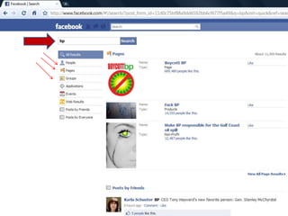 The document outlines various tools and sites for searching people and companies on social networking platforms, including Twitter, LinkedIn, and Facebook. It mentions specific search tools like Topsy and SocialMention, as well as additional resources for finding information. The intent is to assist users in locating desired information on social networks.