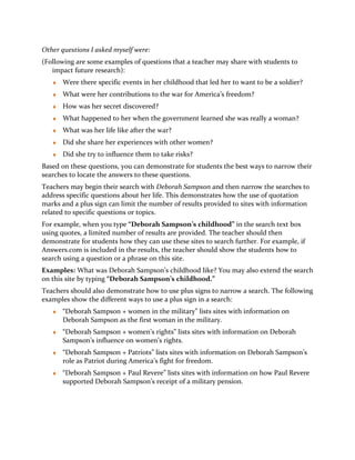 This document provides guidance for teachers to demonstrate effective search strategies to middle and high school students. It involves choosing a topic such as Deborah Sampson and modeling how to formulate focused questions to guide research, using quotation marks and plus signs to narrow searches. Teachers should demonstrate searching different sites and how to locate answers to the questions. The goal is for students to then apply these skills to effectively search for information to answer teacher-provided or self-generated questions.