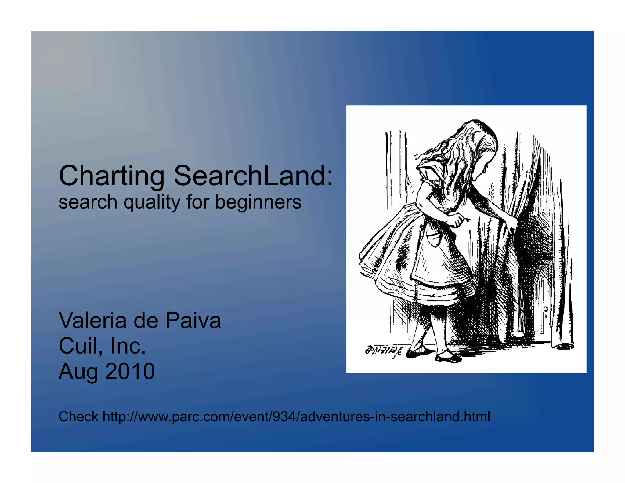 This document provides an overview of search quality evaluation for beginners. It introduces the concept of "SearchLand" as a metaphor for the domain of web search engines. The document outlines some basics of how search engines work, including crawling, indexing, and ranking pages. It then discusses challenges in measuring search quality, including evaluating relevance, coverage, diversity, and latency. The document concludes by acknowledging the complexity of search quality and outlining opportunities for continued improvement through metrics and analysis.