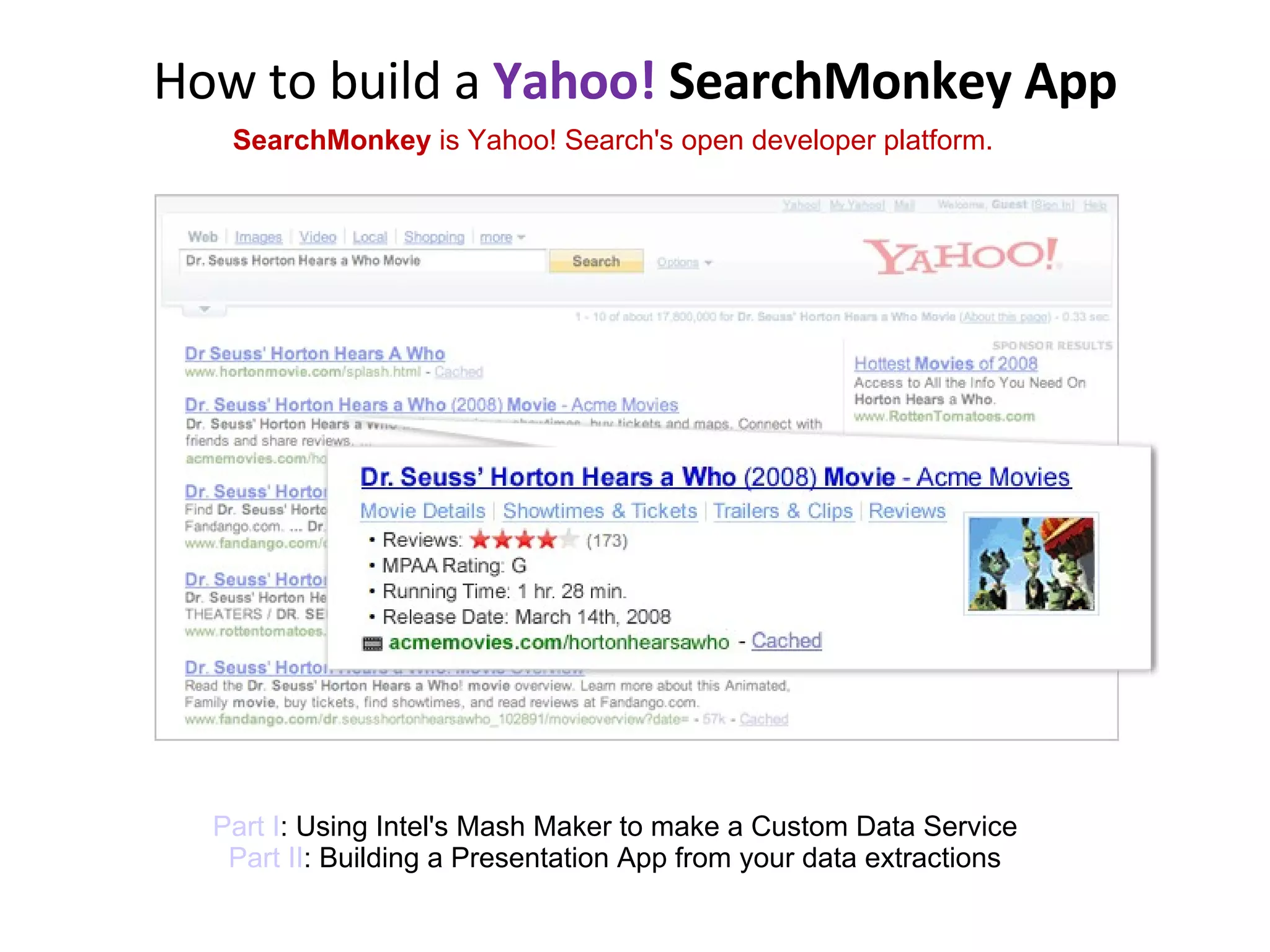 The document provides a detailed guide on how to build a Yahoo! SearchMonkey application using Intel's Mash Maker to create custom data services and presentation apps. It includes step-by-step instructions for data extraction, publishing data, and organizing it into a presentation application, as well as troubleshooting tips and resources for further learning. Appendices cover additional functionalities such as extracting links and adding stars to enhance the application.