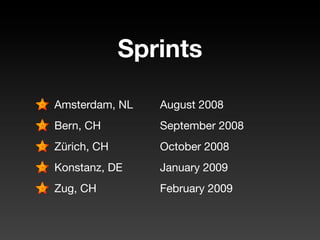 1. Past and upcoming Seaside sprints in various locations between 2008-2009.