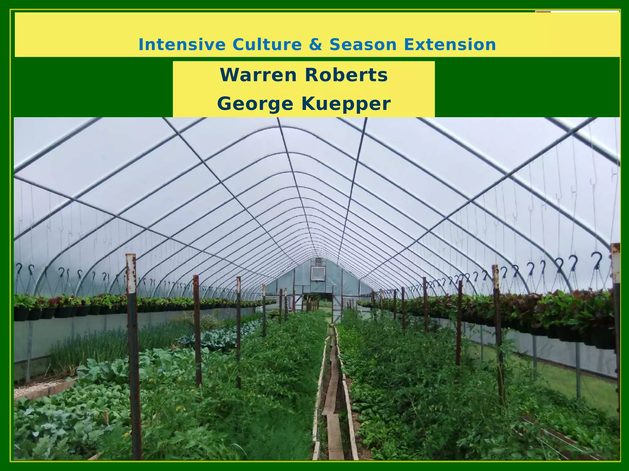 The document outlines optimal temperature ranges for the production of various crops, categorizing each by optimum, minimum, and maximum temperatures. It discusses season extension techniques, including the use of greenhouses, hoop houses, and other methods to cultivate crops beyond their normal growing season. Additionally, it highlights strategies for managing both cold and hot weather conditions to improve crop resilience.