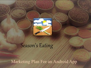 This document provides a marketing plan for a recipe search Android app called "Season's Eating". The app allows users to search for recipes based on the weather and ingredients they have. It will have free and premium versions. The plan outlines the app's features, target markets, competitors, branding, pricing, communication strategies, and implementation schedule. The goal is to establish brand equity and generate revenue of Rs. 3 crore in the first year and Rs. 25 crore in 4 years.