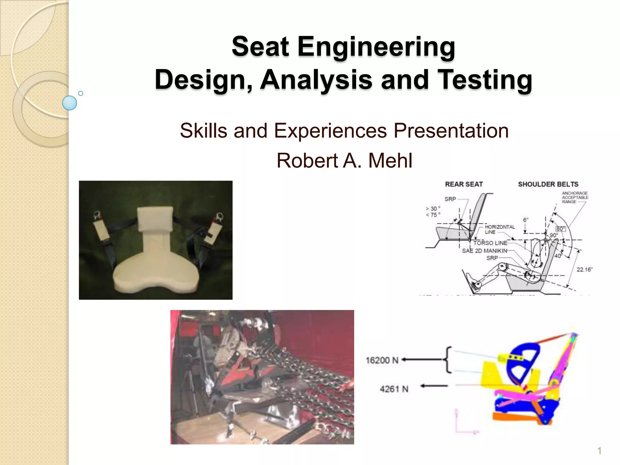 Robert A. Mehl has experience in seat engineering, structural analysis, testing, and design. He has performed structural analysis using FEA on automotive seats to evaluate loading conditions. He has also provided litigation support analyzing automotive crash test data. Mehl has experience designing seatbelt systems, ensuring proper strength, routing and accessibility to meet safety standards. Additionally, he led the design of a military gunner turret sling seat, meeting requirements for increased comfort, survivability, and blast performance while reducing costs.