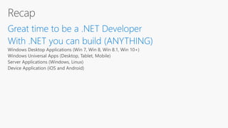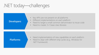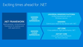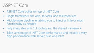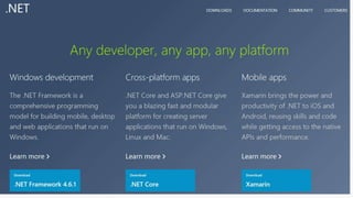 .NET Framework, .NET Core, and Xamarin are highlighted as key app models and base libraries. Various development tools and resources are referenced with links to GitHub for core libraries, ASP.NET, and Docker deployment tutorials. The document emphasizes the open development aspect and showcases performance metrics for ASP.NET Core.