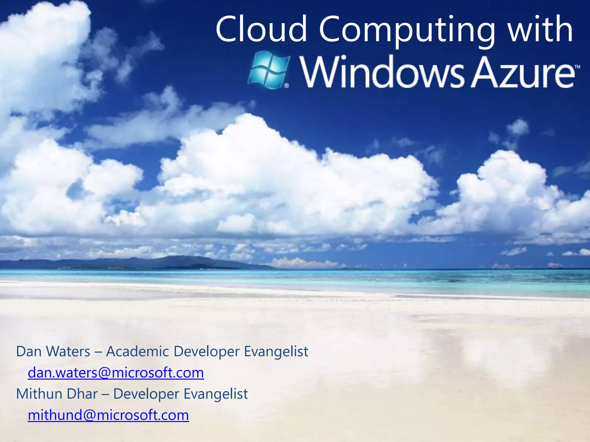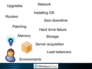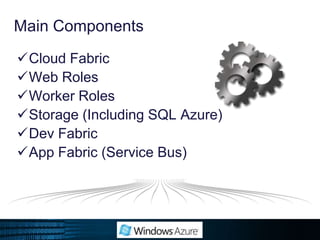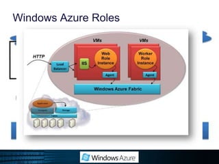 The document discusses cloud computing and Microsoft Azure. It provides an overview of Azure including its data centers, virtual machines, storage options like blobs and tables, services like App Fabric, and the Fabric Controller which manages virtual instances and load balancing. It also discusses the different roles in Azure like Web Roles and Worker Roles and platforms offered, such as Infrastructure as a Service, Platform as a Service and Software as a Service.