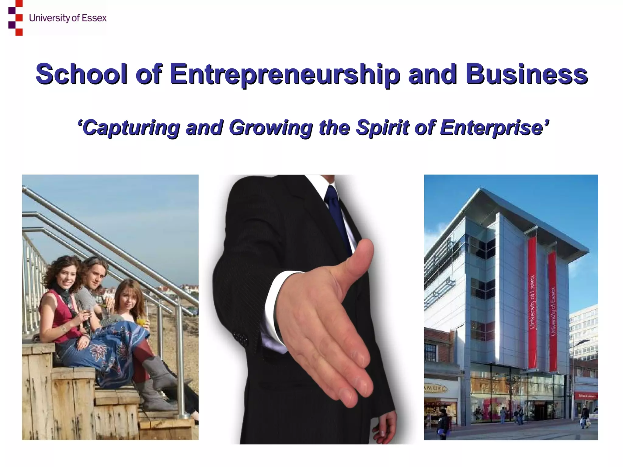 The document summarizes the School of Entrepreneurship and Business at the University of Essex. The school focuses on entrepreneurship through an interdisciplinary lens, covering topics like economics, business, marketing, and creativity. It offers undergraduate and postgraduate programs in entrepreneurship and holds research centers studying areas like social entrepreneurship and regional development. The school aims to provide real-world experience through case studies, business links, and international partnerships to help students succeed in entrepreneurship.
