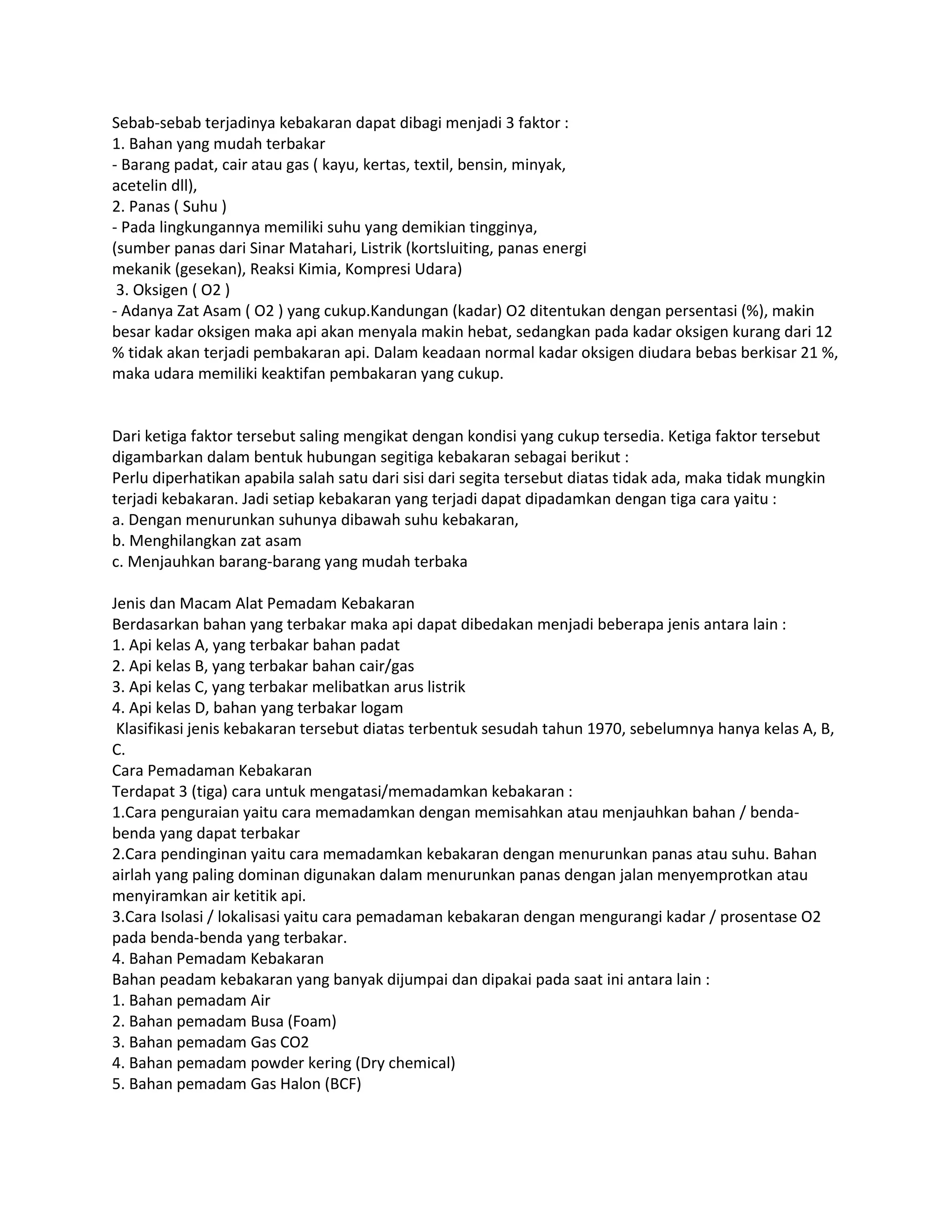 Tiga faktor penyebab kebakaran adalah bahan mudah terbakar, panas, dan oksigen. Ada empat jenis api berdasarkan bahan yang terbakar: kelas A (padat), kelas B (cair/gas), kelas C (listrik), dan kelas D (logam). Cara memadamkan kebakaran meliputi menjauhkan bahan mudah terbakar, mendinginkan, dan mengurangi oksigen. Bahan pemadam kebakaran utama adalah air, busa, CO2, bubuk kering, dan