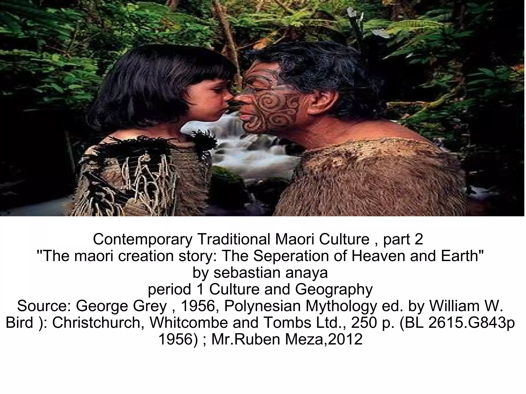 The Maori creation story tells of Rangi (Heaven) and Papa (Earth) who were originally joined together, keeping the world in darkness. They had six sons: Tane-mahuta (forests), Tawhiri-ma-tea (winds), Tangaroa (sea life), Tu-matauenga (humans), Haumia-tikitiki (uncultivated food), and Rongo-ma-tane (cultivated food). After a long time in darkness, the sons pushed Rangi and Papa apart, separating heaven and earth and bringing light to the world. In the process, Tu-matauenga ate four of his brothers but spared