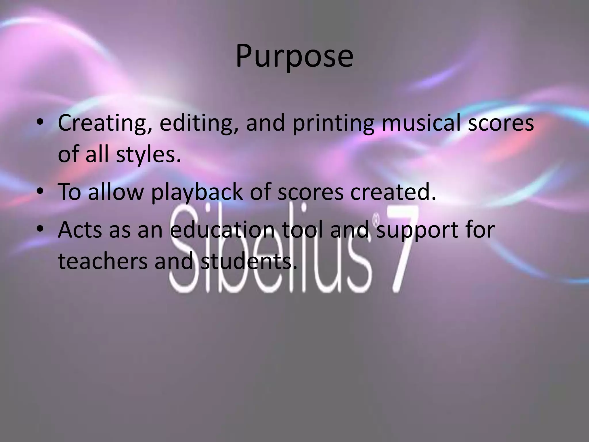 This document discusses a music notation software that allows users to create, edit, and print musical scores of all styles while also allowing playback of created scores. It acts as both an educational tool and support for teachers and students. The software can create all types of scores for choral, band, and orchestral music, supports all musical notation, and allows scores to be played back or turned into audio files. It provides advantages over handwriting scores by being neater.